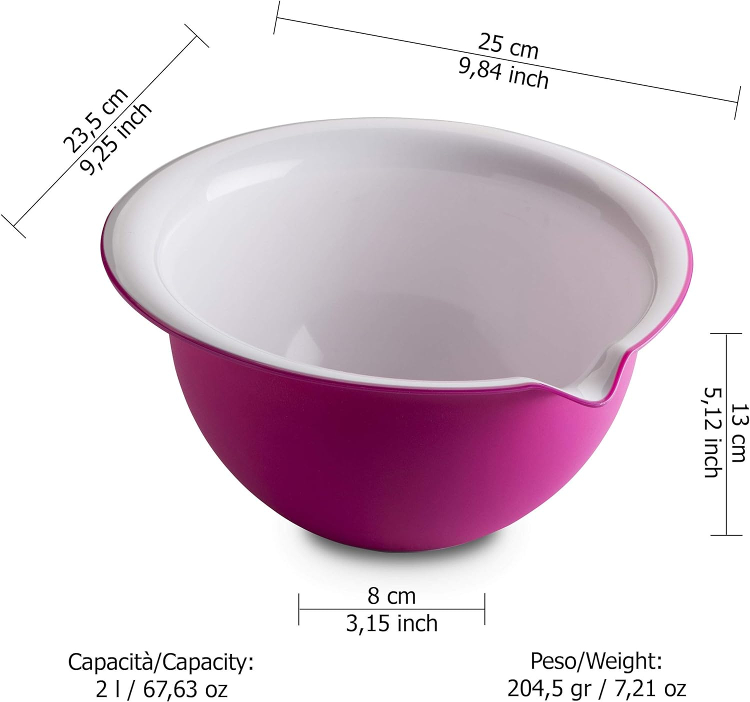 Bol/castron/salatier de 2 litri Contine antibacterianul Microban®, mai multe informatii pe: www.microban.com Poate fi folosit in bucatarie in o mie de moduri diferite, datorita "curgatorului" special este perfect pentru a face aluaturi lichide pentru prajituri, creme, sosuri care trebuie turnate apoi fara a se murdari sau risipi continutul. Ușor de stivuit, vă permite să maximizați spațiul din rafturi, păstrând în același timp caracteristicile de lejeritate și rezistență. Se poate spăla în mașina de spălat vase, trece cu ușurință de la congelator la cuptorul cu microunde fără a deteriora sau deteriora alimentele.