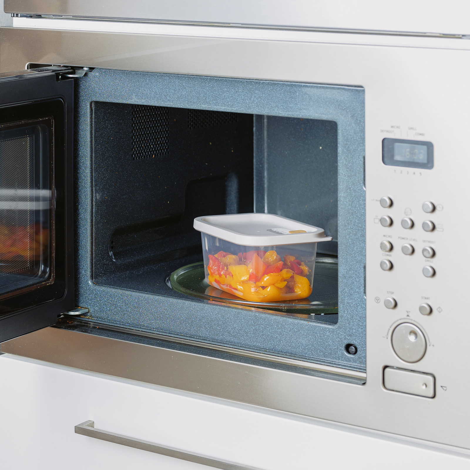 Ridicand supapa corespunzatoare pozitionata pe capac, acest recipient poate fi folosit in cuptorul cu microunde cu capac.