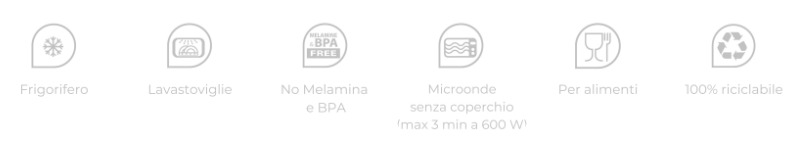 Vasul este fabricat din polipropilenă cu fibră de sticlă pentru o rezistență superioară, este stivuibil, se poate spăla în mașina de spălat vase și potrivit pentru utilizare în frigider și cuptor cu microunde.