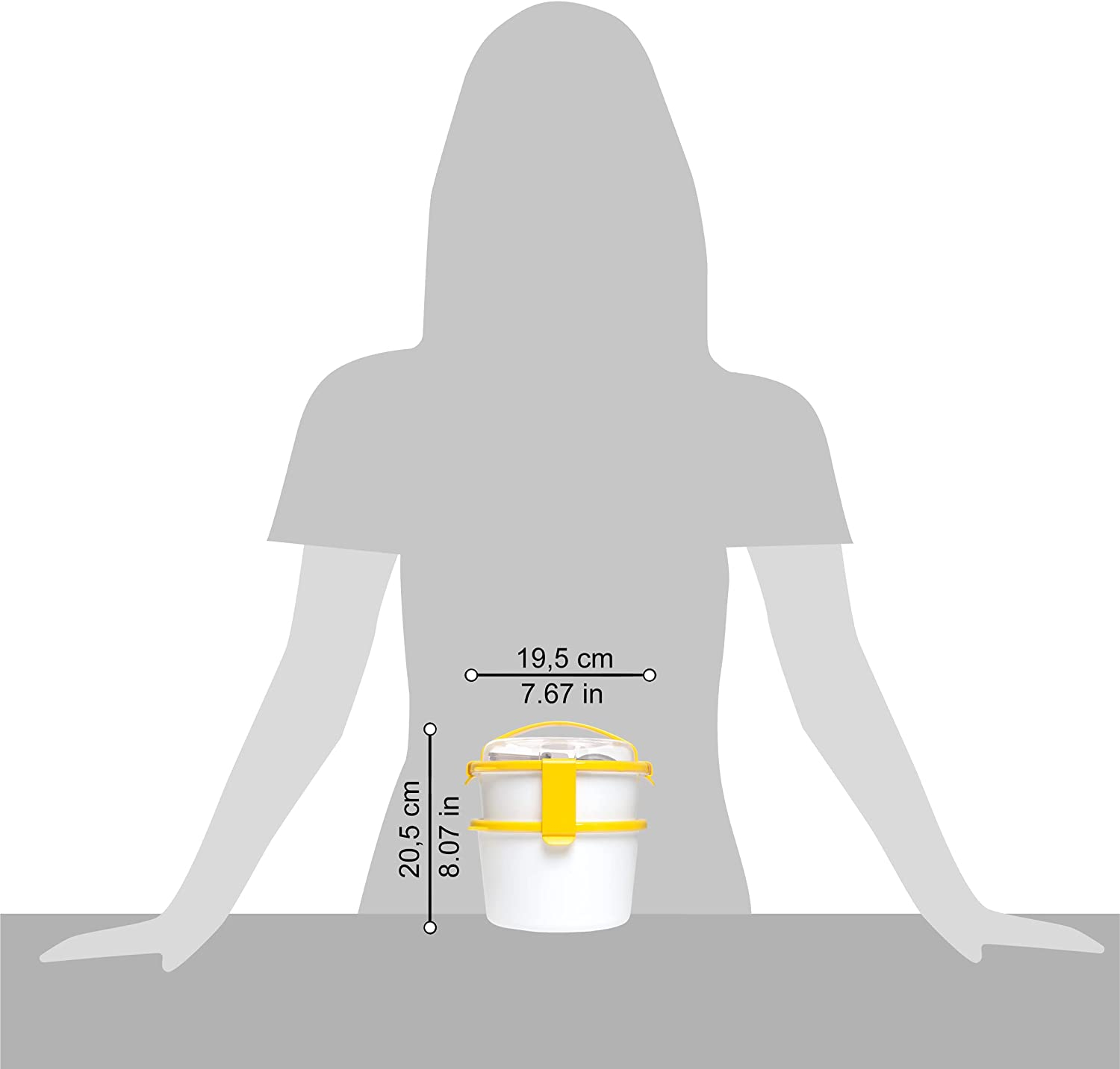 Totul este sustinut si ridicat de 2 clapete laterale confortabile și un maner pentru a-l transporta confortabil oriunde doriți. Greutate 188 g Dimensiuni 19,5×18,5×20,5 cm + 11x11xh15cm Capacitate: 1 L + 1.6 L Material: PP Microban®-