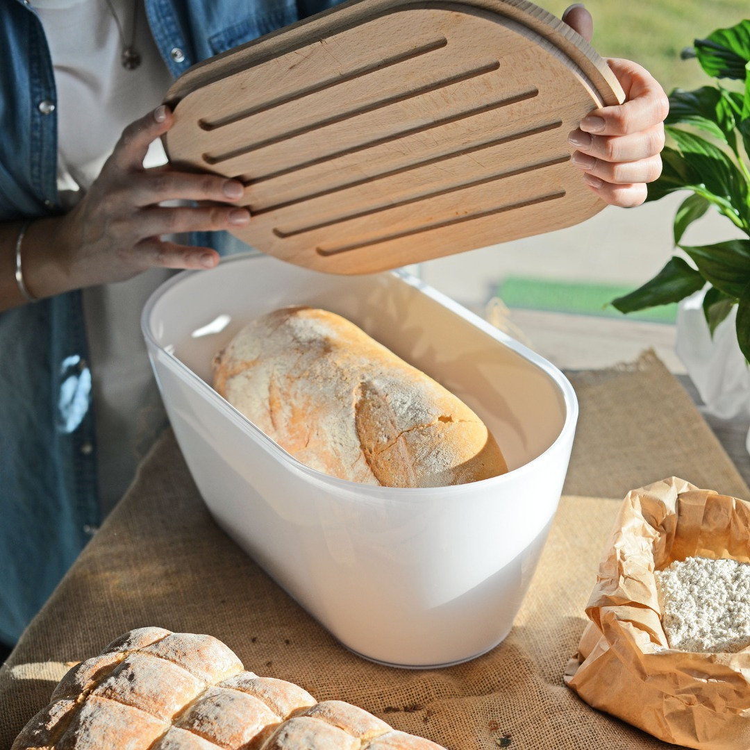 Capacul din lemn de fag este conceput pentru a izola din exterior conținutul cutiei de pâine, dar poate fi și scos și folosit ca placă de tăiat, datorită canelurilor practice pentru colectarea firimiturii. Recipientul, care menține pâinea proaspătă mai mult timp, este complet și ușor de spălat vase, ceea ce economisește și timp prețios.
